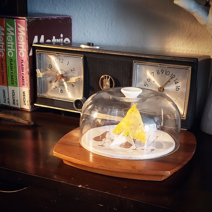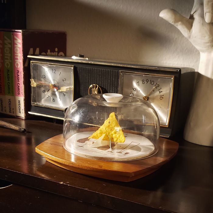 The couple decided to put the precious piece of Dorito under a glass bowl to save it for later.