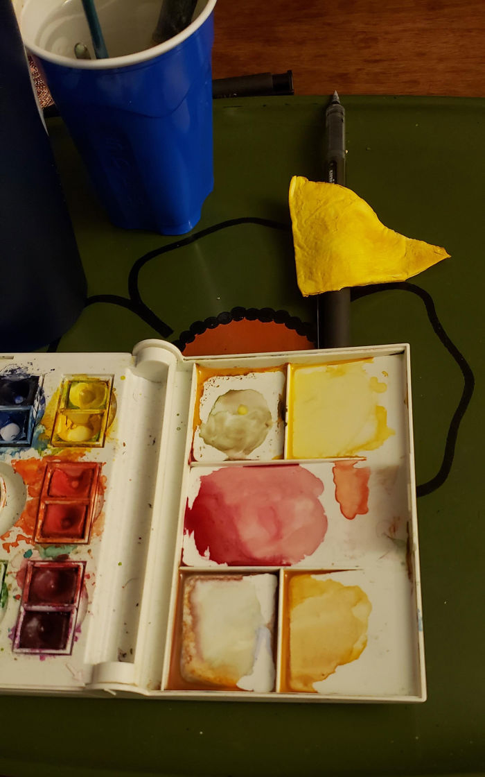 “I put the ‘chip’ in my toaster oven to dry it out. “I [picked up] the watercolor paints I was using on an illustration to give the wet TP a base yellow. I dried it mostly in my toaster oven, which I’ve since cleaned, then added more coloring, glue and tried to mold it,” he explained.