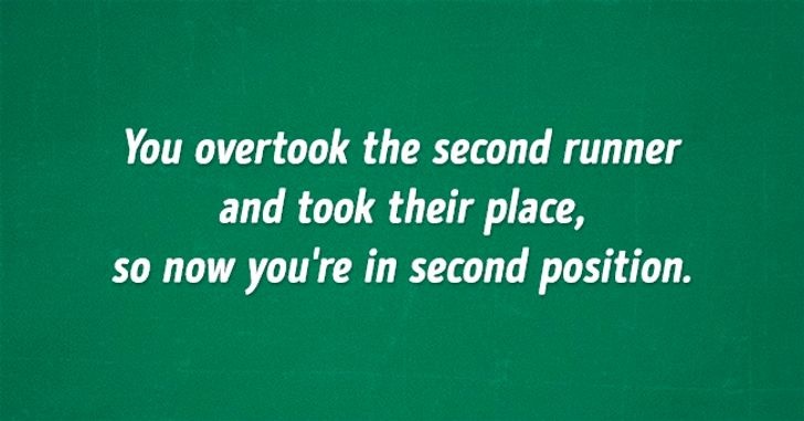If you already answer first, we’re sorry to tell you that you’re wrong. Think about it for a second. To become number one, you have to pass the first runner. If you pass the second one, you simply take over their position as the second runner!