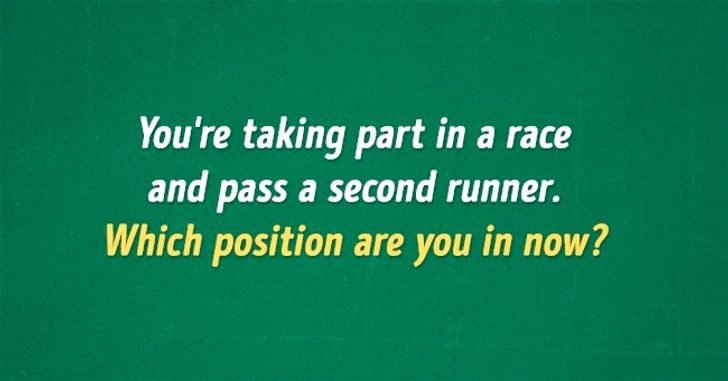 In the first challenge, imagine that you are a runner who joined a marathon. During the race, you pass the second runner. Which position are you in after passing the second runner?