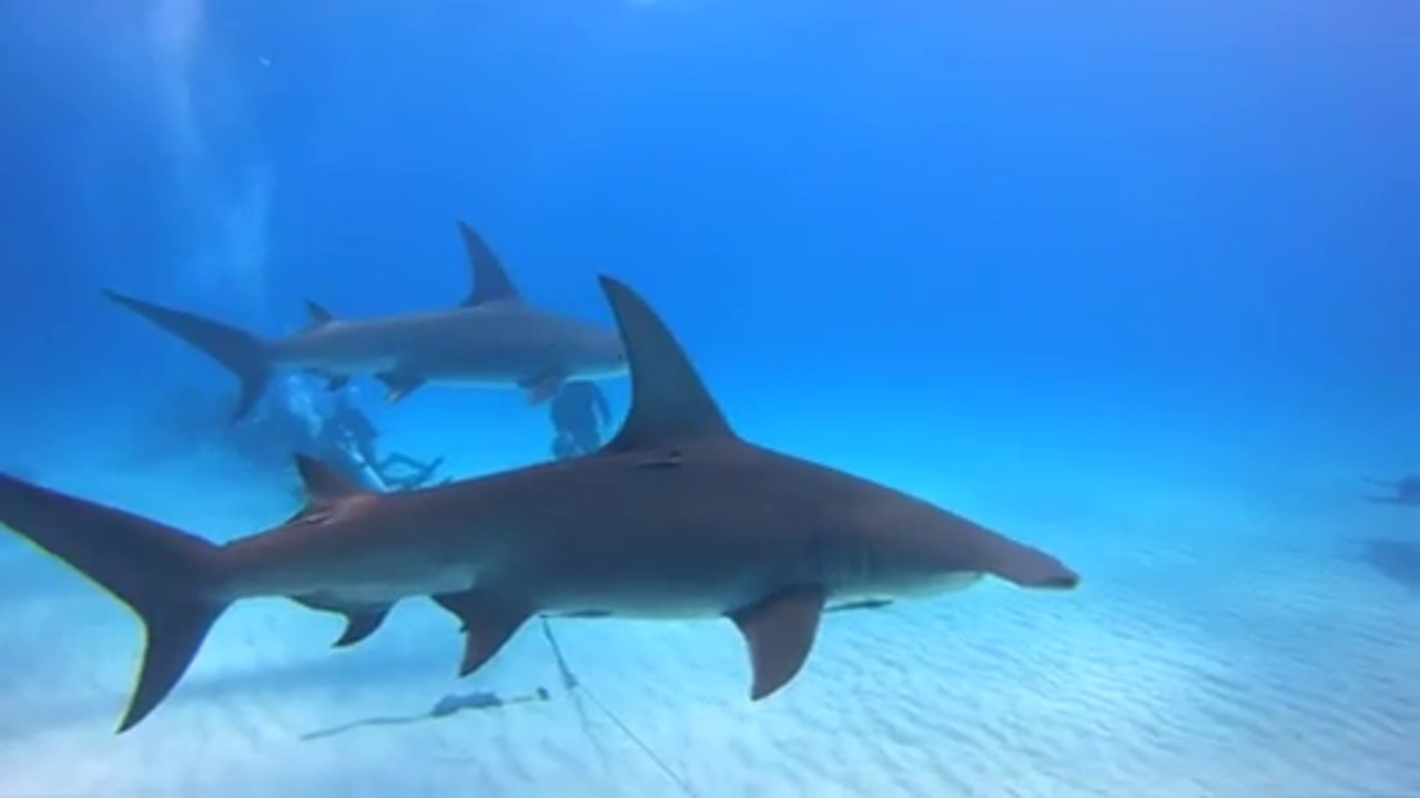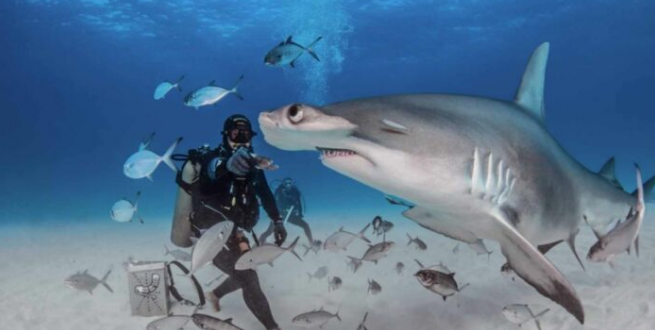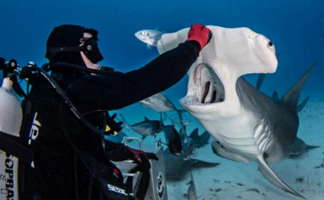 Other footage showed a courageous man feeding a giant hammerhead by hand and a diver maneuvering a predator away from the camera by its large snout.