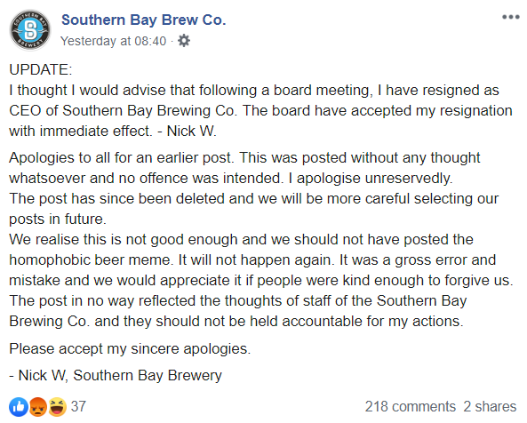 “The post in no way reflected the thoughts of staff of the Southern Bay Brewing Co. and they should not be held accountable for my actions. Please accept my sincere apologies.”
