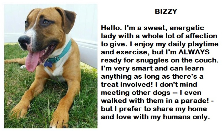 “Bizzy has been with the rescue since June 2018, she has bounced around from home to shelter to home. She hasn’t had the best luck living with other dogs but she is not reactive on walks when she meets other dogs.