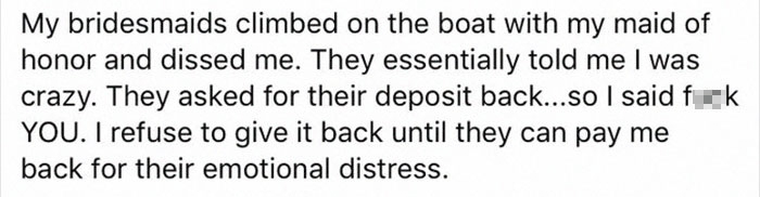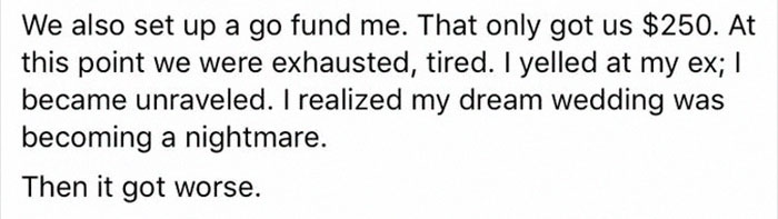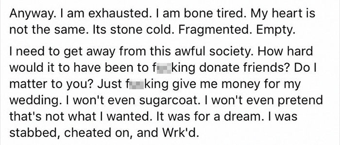 Only eight people RSVP’d and sent the check; her maid of honour backed out as well. The couple set up a GoFundMe page that could collect only $250.