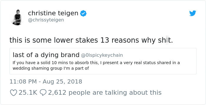A Twitter user @0lspicykeychain, a member of a “wedding shaming” group on Facebook, a place on the internet where people go to shame weddings, shared her special day horror story which instantly went viral and made Chrissy Teigen comment on it.