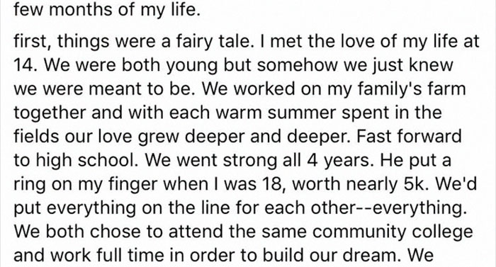 The woman shared that she and her partner broke up due to “recent and irreparable problems.” She then explained how the two met at age 14, fell in love, got engaged at 18 (with a $5,000 ring), and had a child together in their early 20s.