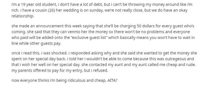 She asked Redditors, ‘AITA for refusing to go to my cousin’s wedding because she’s making guests pay to enter?’