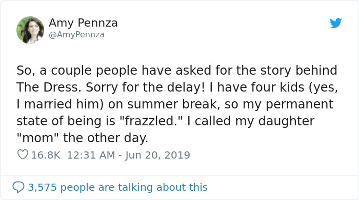 “So when she spotted The Dress at an incredible bargain, she couldn’t turn it down. If you ask her now, she says she feels terrible about it. Although, she also told me, ‘I think I’ve still got it. We should raffle it off.’”