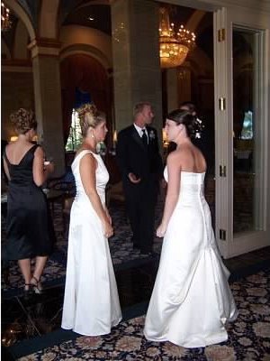 “The morning of the wedding, all the women in the bridal party cram into a tiny room in the church. You know, body glitter and hairspray everywhere. Fifteen coats of mascara. Putting napkins under your pits so you don’t sweat on your dress.