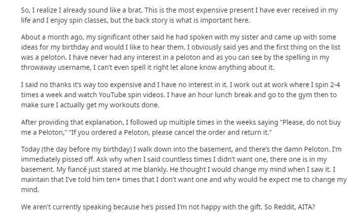 The bride-to-be asked the Redditors, ‘Am I The A****le for being upset that she got a Peloton for her birthday.