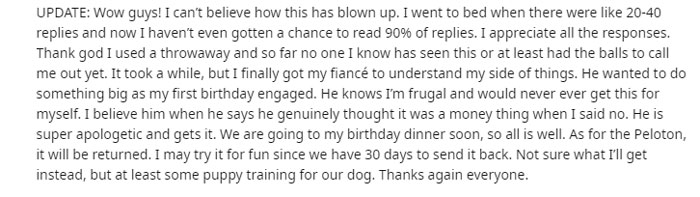 The bride-to-be told that her fiance gifted her a Peloton despite she asked him not to buy it.