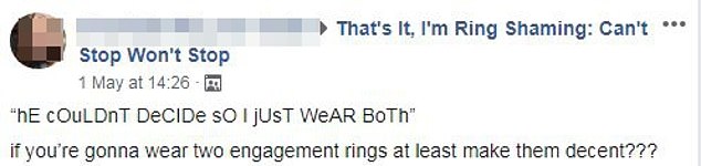 Soon after the woman’s confession on Facebook, people shared her story on a page called ‘That’s It I’m Ring Shaming: Can’t Stop Won’t Stop’ where commenters couldn’t hold back in slamming the couple.