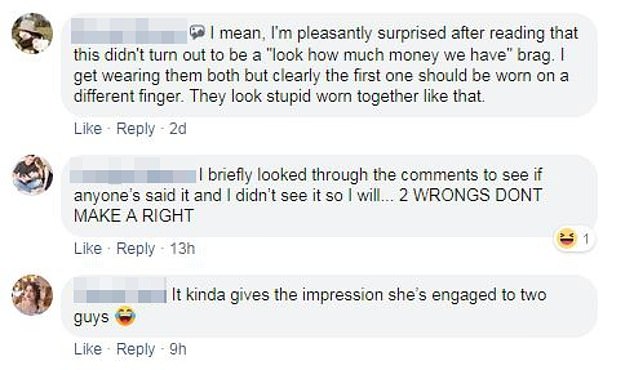 “He couldn’t decide so I just wear both. If you’re gonna wear two engagement rings at least make them decent????” one person wrote while others suggested it looked like she was engaged to two guys at the same time.
