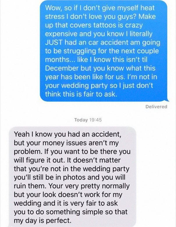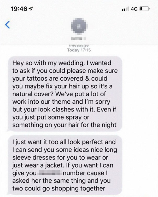 As the woman with the tattoos revealed in a Facebook post in a group called ‘that’s it, I’m wedding shaming (non ban-happy edition),’ both her tattoos and her hair color bothered the bride-to-be who claimed her looks would ruin the wedding pictures.