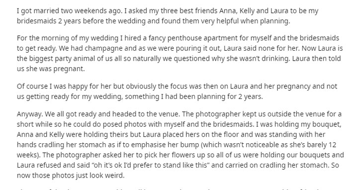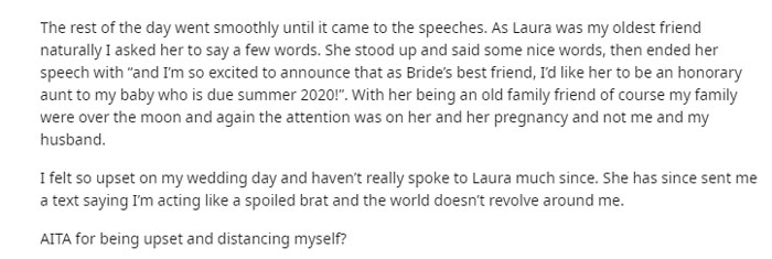 However, one of them, who was her oldest and closest friend, ruined her big day after she made an announcement of her own.