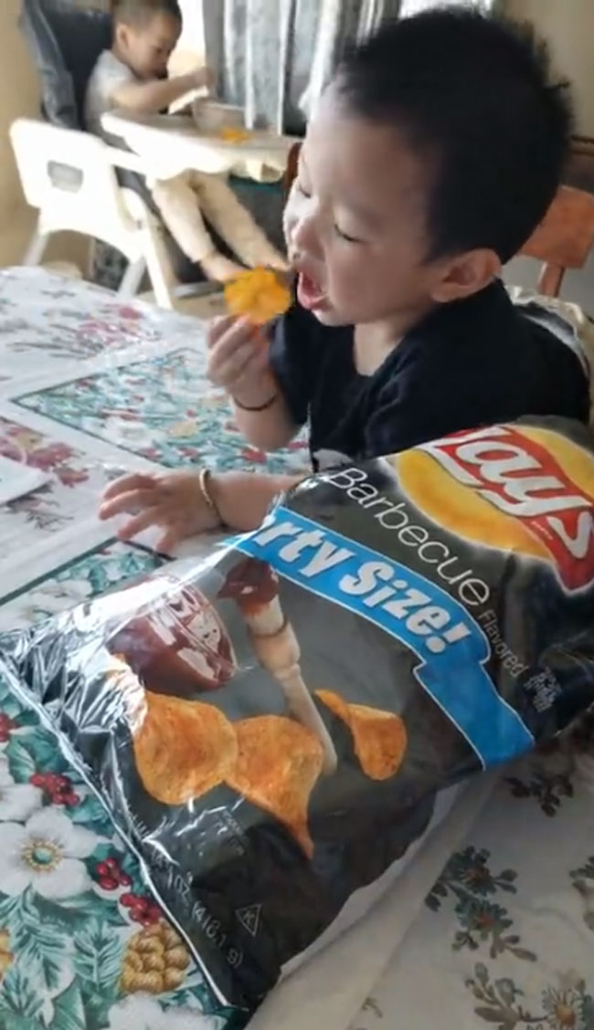 The hilarious video shows two young brothers, from Brooklyn Park, Minnesota, eating barbecue crisps.