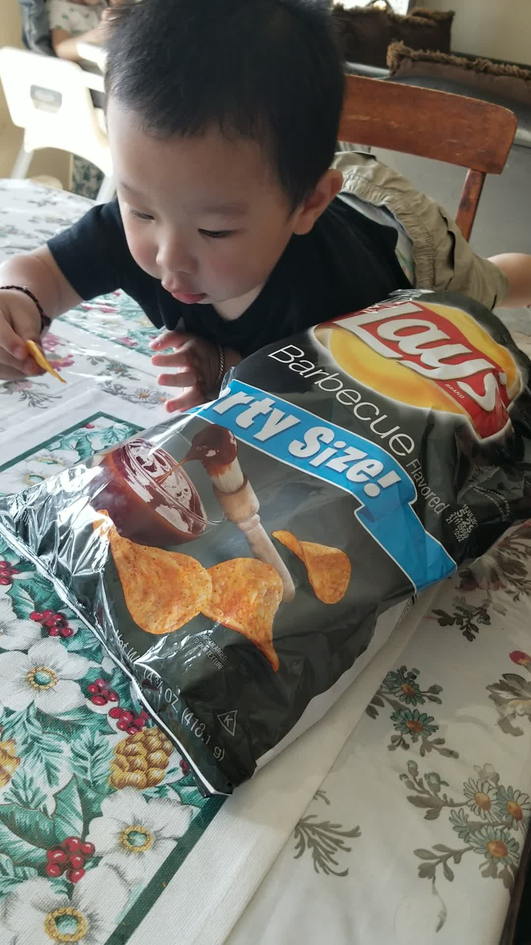 Then they dip their chips into a photograph of a bowl of barbecue sauce pictured on the barbecue crisp packet without noticing that the dip was not real and it was just a picture.