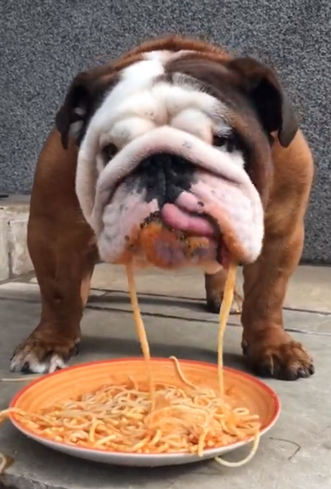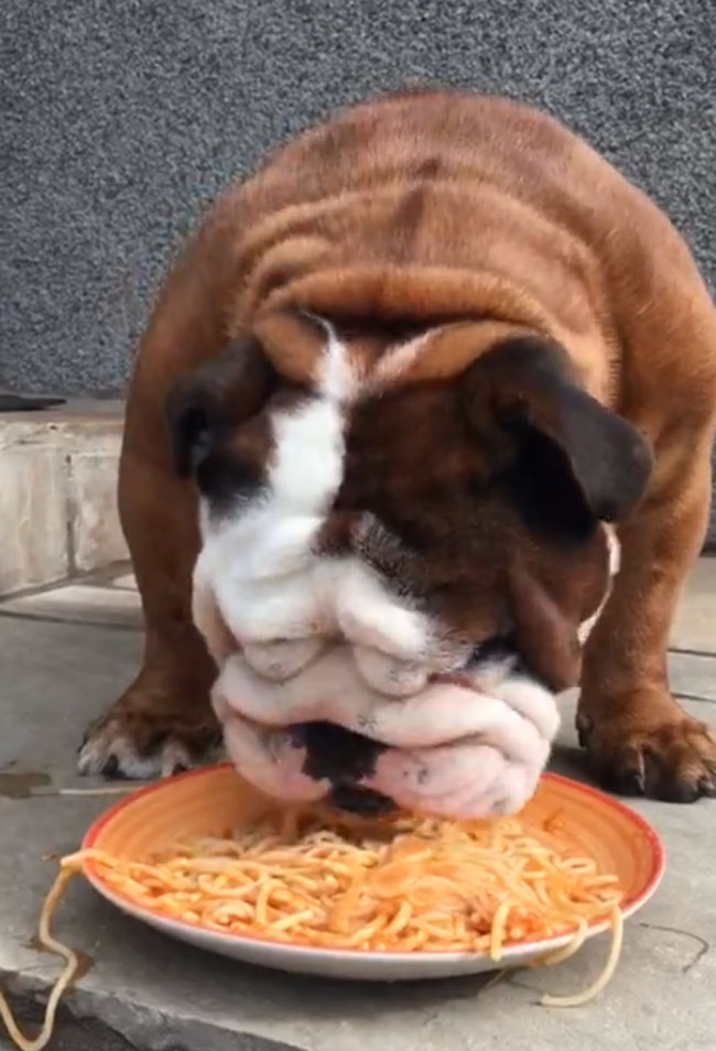 Who doesn’t love to eat spaghetti? Well, everyone does, including this adorable bulldog.