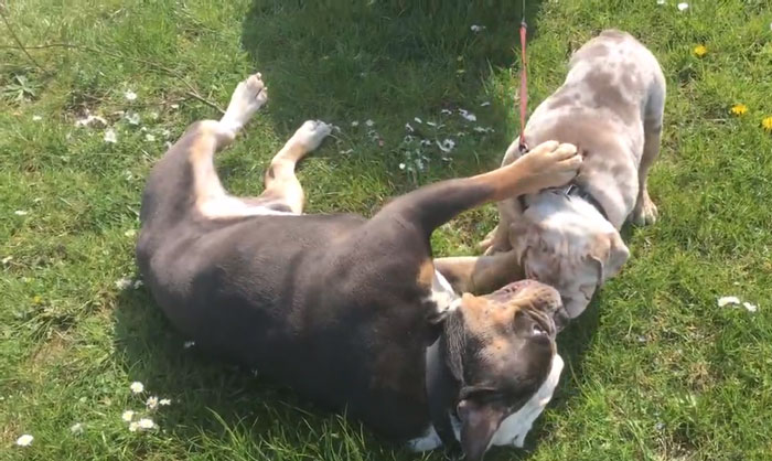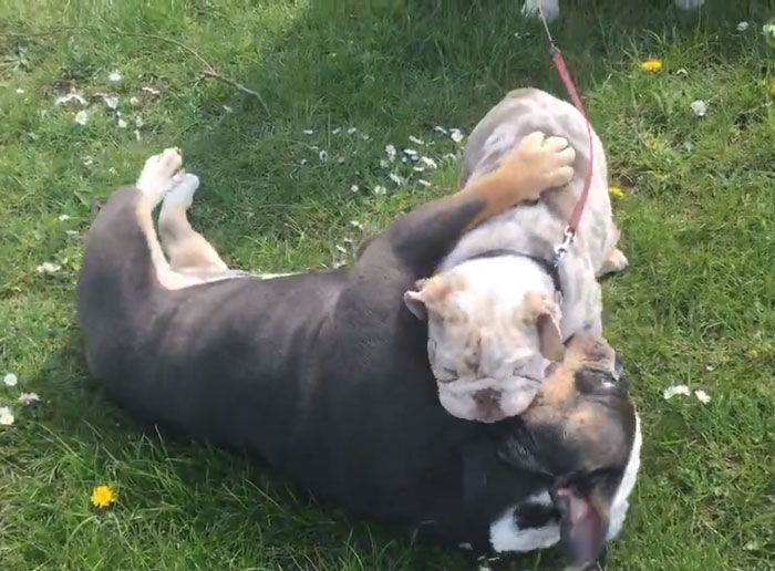 An adorable video of a bulldog has emerged that shows him playing with a puppy.