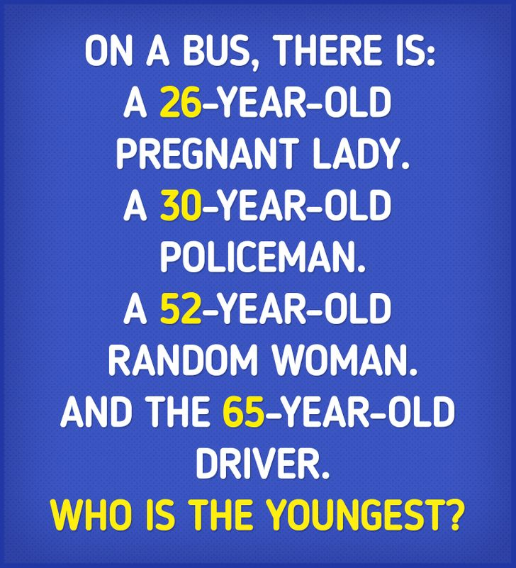 “In a bus, there is: a 26-year-old pregnant lady. A 30-year-old policeman. A 52-year-old random woman. And the 65-year-old driver. Who is the youngest?”