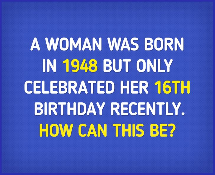 “A woman was born in 1948 but only celebrated her 16th birthday recently. How can this be?”