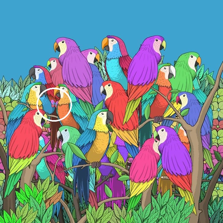 Parrots of all colors have gathered in one place to test your observation skills and patience.