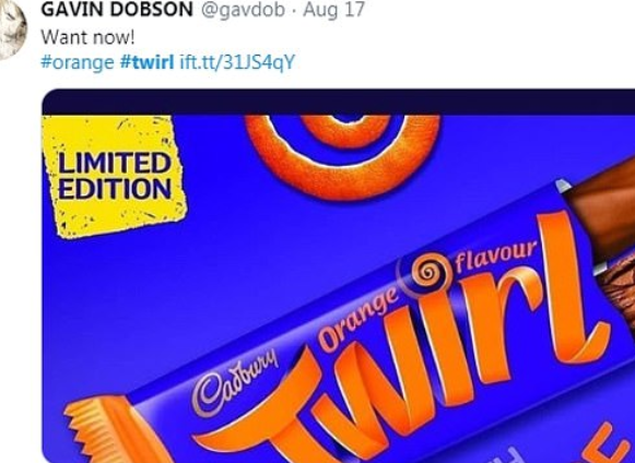 The U.K. Cadbury fans have begun sharing the news and pictures of Twirl’d orange flavor on Twitter.