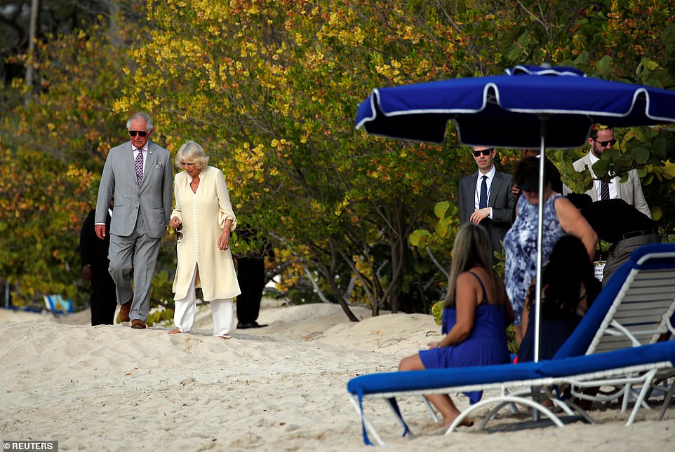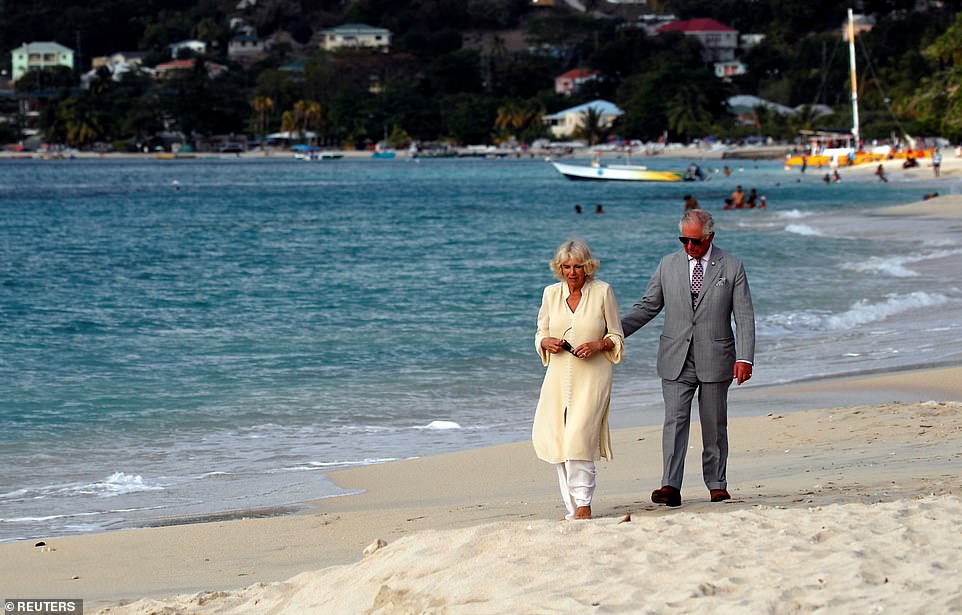 The couple made their way to Grand Anse Beach, with Camilla kicked off her wedges and went barefoot for a stroll along the beach with Charles.