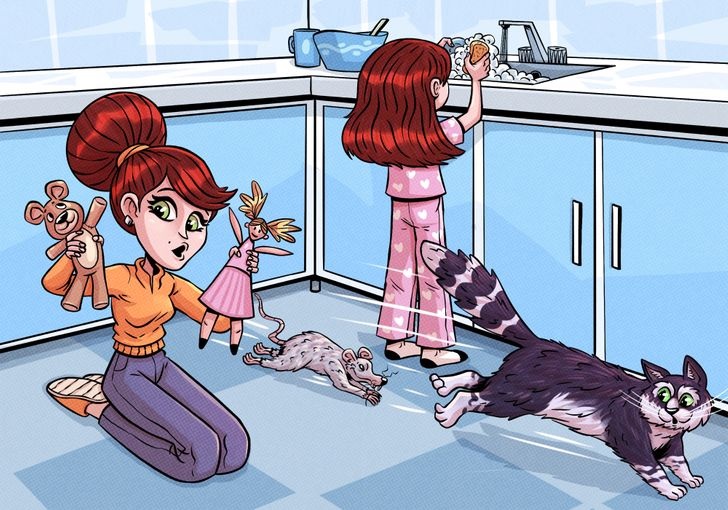 If you really focused hard, you probably noticed how everyone’s role has been reversed in this image. For instance, the mother is playing with dolls while her young daughter is washing the dishes. Meanwhile, do you notice the mouse chasing the cat?