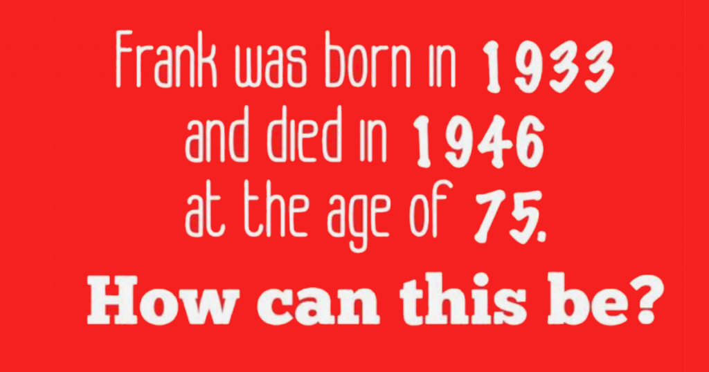 We have other riddles and quizzes for you to solve. Are you ready? Here it is. In the riddle, it states, Frank is born in 1933 and died in 1946 at the age of 75. How could this be? Could you already tell by the first glance of how the answer came to be, or will you need hints along the way?