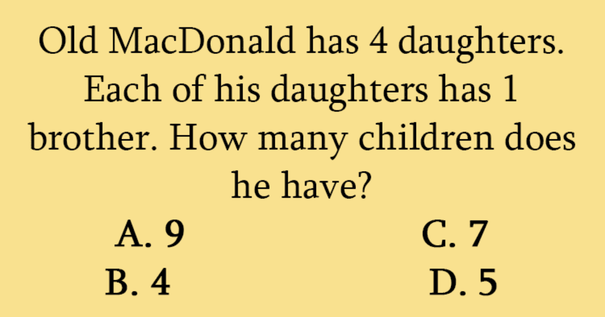 If you chose FIVE children then congratulations because that is indeed correct! If you read between the lines, you certainly wouldn’t have been confused by the tricky details mentioned!