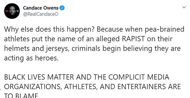 “Why else does this happen? Because when pea-brained athletes put the name of an alleged RAPIST on their helmets and jerseys, criminals begin believing they are acting as heroes,” Owens said.
