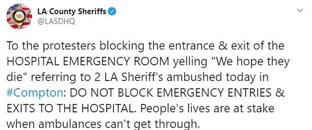 “To the protesters blocking the entrance & exit of the HOSPITAL EMERGENCY ROOM yelling “We hope they die” referring to 2 LA Sheriff’s ambushed today in #Compton: DO NOT BLOCK EMERGENCY ENTRIES & EXITS TO THE HOSPITAL. People’s lives are at stake when ambulances can’t get through,” LA County sheriffs wrote on Twitter.