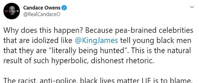 Owens wrote on Twitter: “Why does this happen? Because pea-brained celebrities that are idolized like @KingJames tell young black men that they are “literally being hunted”. This is the natural result of such hyperbolic, dishonest rhetoric.”