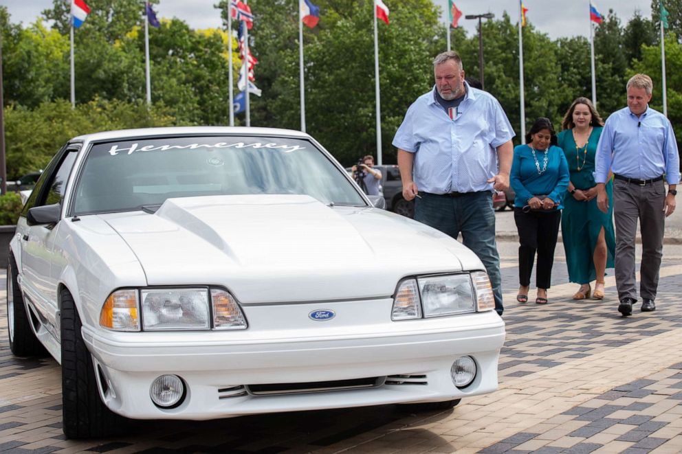 Wesley Ryan and his family reached Ford World Headquarters in Detroit, where Henry Ford III revealed the refurbished 1993 Mustang to the father.