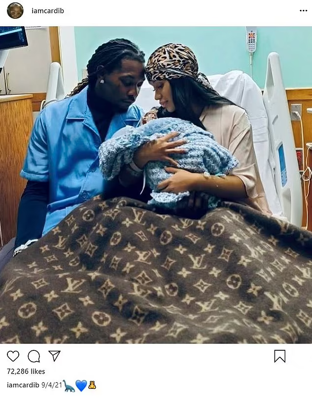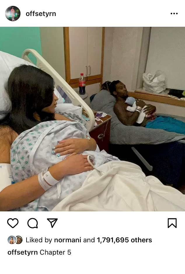 Offset also posted about the birth of their son on his own page, sharing a photo of his wife resting in bed as he held their son close to his chest.