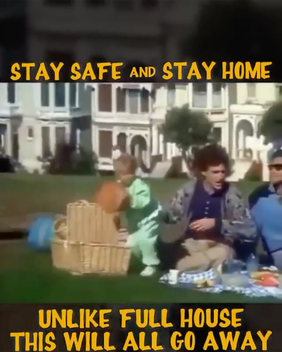 The video ends by resuming the original title sequence of Full House and the words “stay safe and stay home, unlike Full House this will all go away” are displayed on the screen.