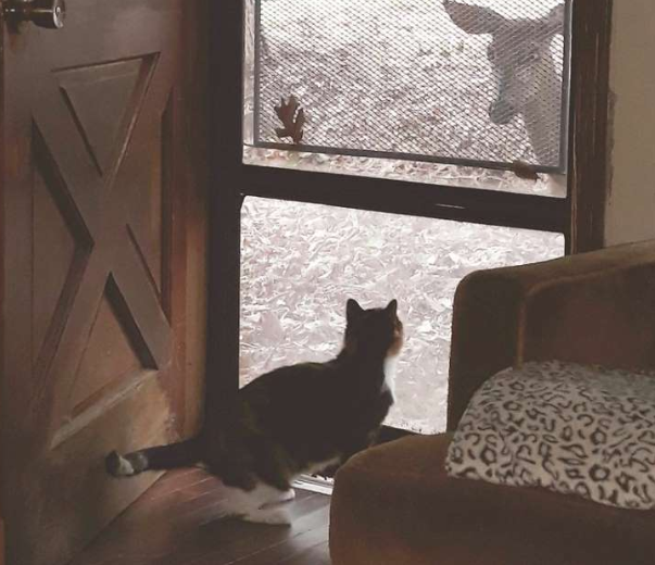 In the video, it looks like the house cat is being called by its new friends outside to play. The deer that are outside can see the cat through a see-through door and wait for it to come out. Both the cat and the deer do not leave each other’s sight.