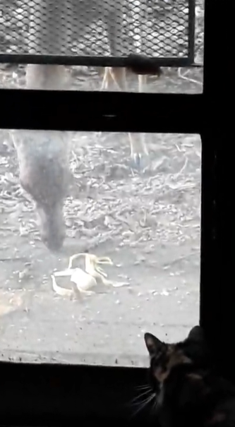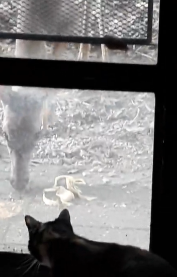 In one of the frames, the cat is even trying to open the door to play with its new found friends.