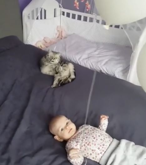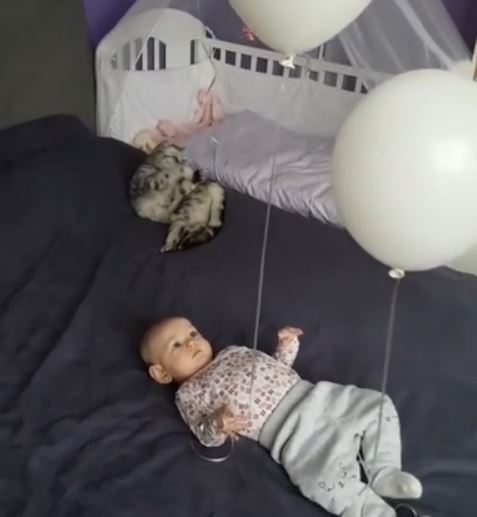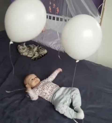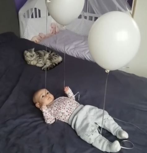 The baby and the cat in the video cannot stop playing with the balloons they have tied on their hands and every time they move their hands, the balloons move too and it turns out thrilling for the two.