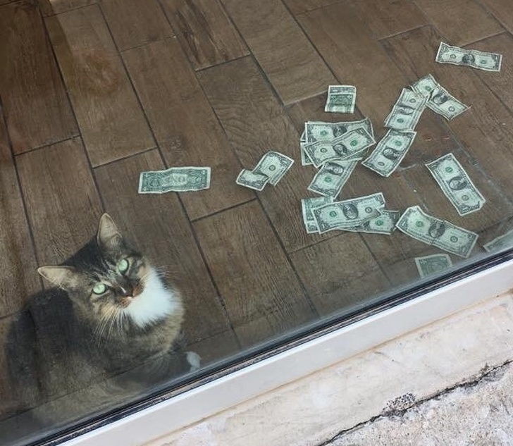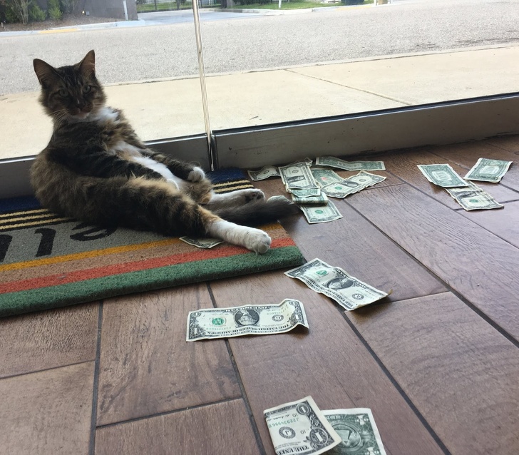 It turned out that this kitty had an unusual talent and people would visit to play with him. Thanks to his charm, more money appeared next to the door.
