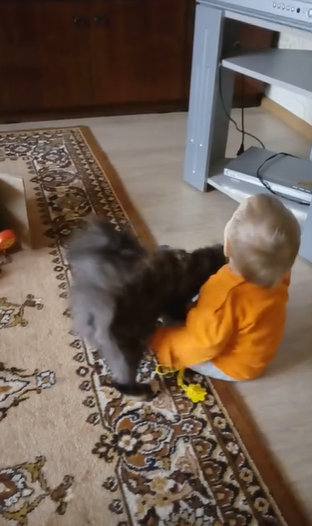 It seems the baby is enjoying the extra affection and attention too. The parent of the child who is recording the video can be heard laughing on the adorable scene too.