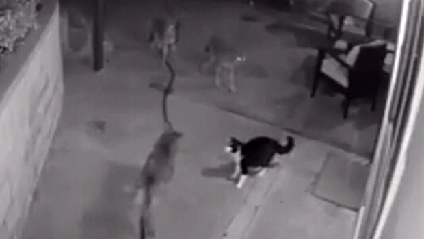 But when they reviewed their security cameras, she found that their feline had been fighting against the wild animals long before she got involved.