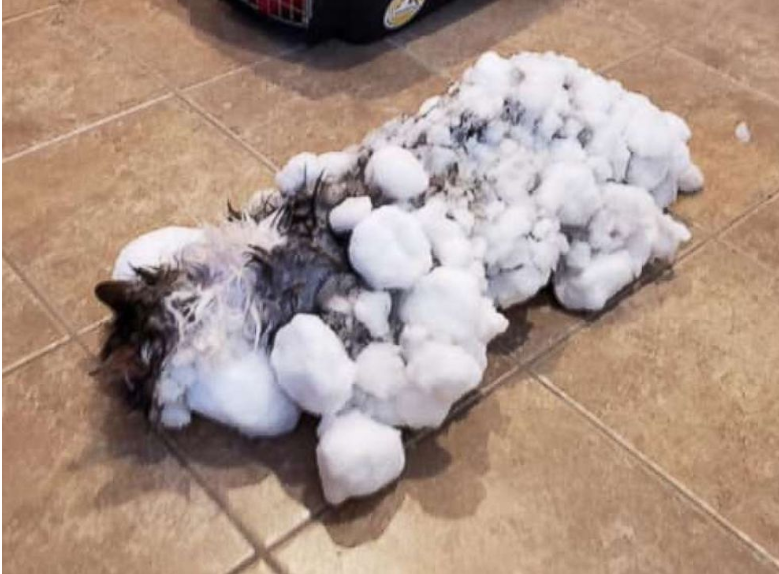 Fluffy’s furs were matted with huge clumps of ice. The cat was warmed for hours using warm water and blankets until she came to her senses.
