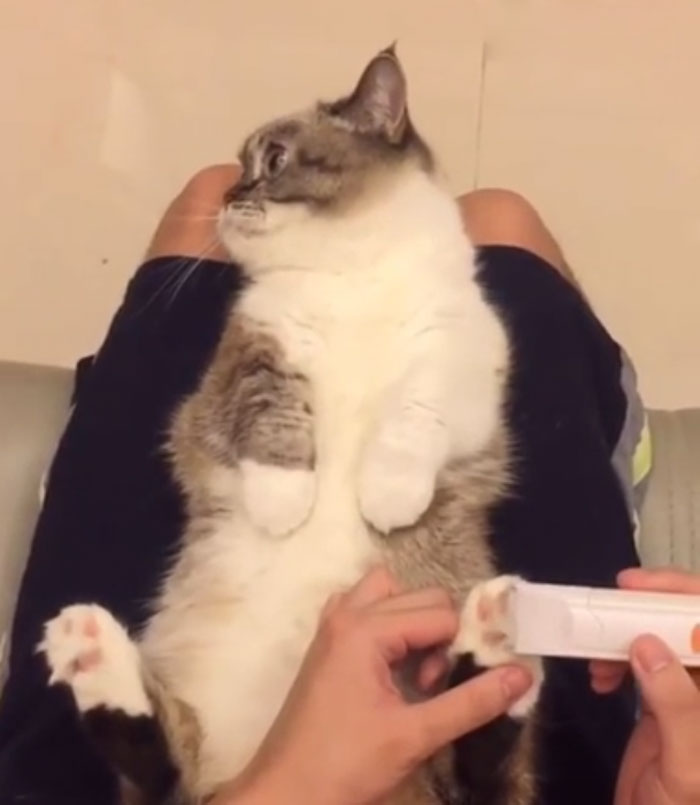 It is hard for cats to sit calmly like this but we guess Pookie loves having its nails clipped.