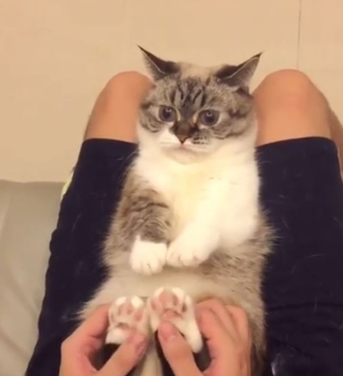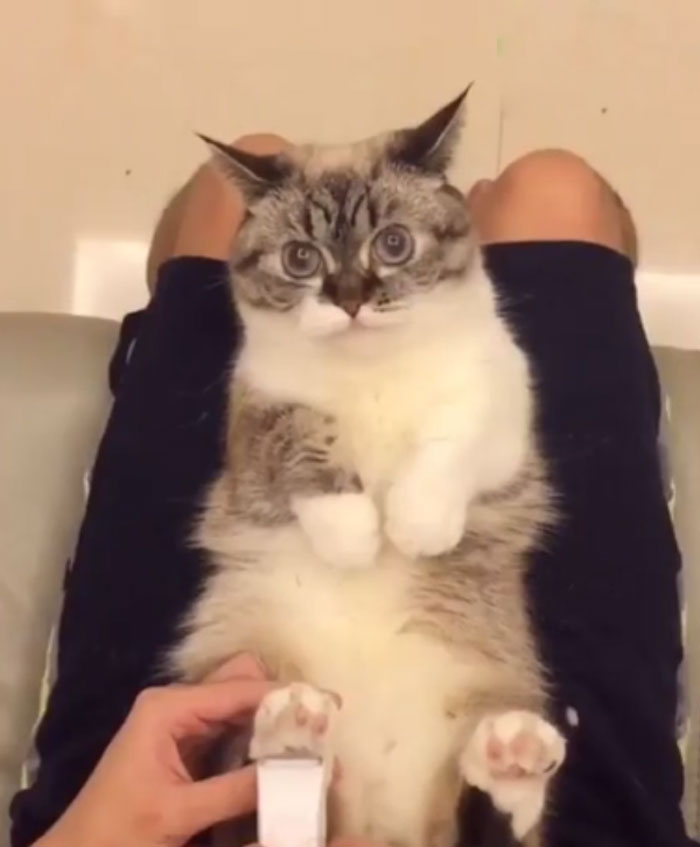 But, this Ragdoll/British Short mixed cat is not one of those cats. The adorable cat named Pookie can be seen sitting on its owner’s legs calmly and having her nails clipped and the fur between her toes trimmed.