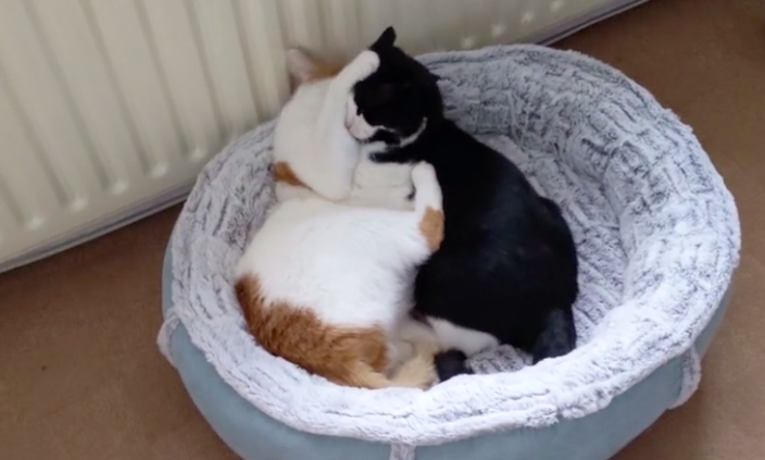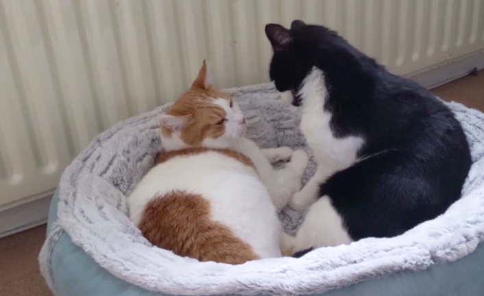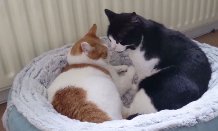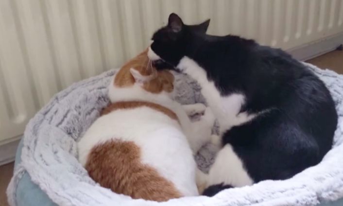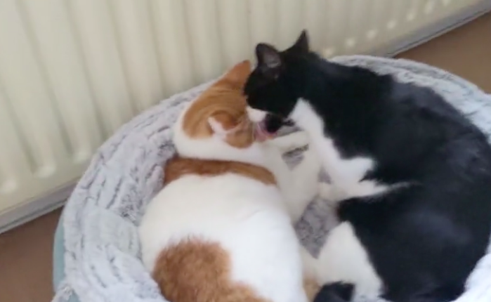 Two cats were lying together on a bed and one of them kisses the other one with real affection.