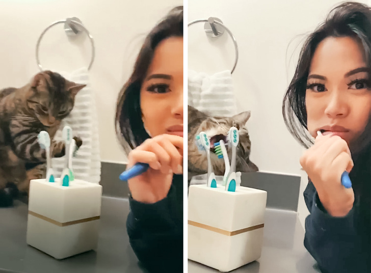 When Achilles was one year old, he started to mirror his owner’s morning routine. He would follow Stephanie into the bathroom and sit on the bathroom counter to watch her.