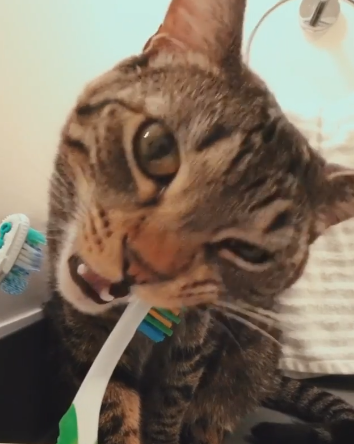 One day when her sisters visited, they put all their toothbrushes in the holder. And, this provided the perfect opportunity for Achilles to have his own toothbrush. He hopped on the bathroom counter and started brushing his teeth with one of the brushed.
