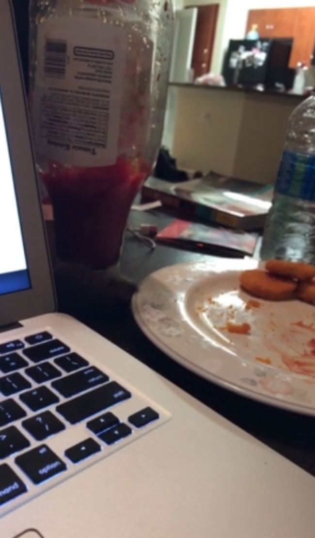 The way this cat is hiding behind the ketchup bottle had me in stitches. That is one smart cat who knows how to steal food without being caught!
